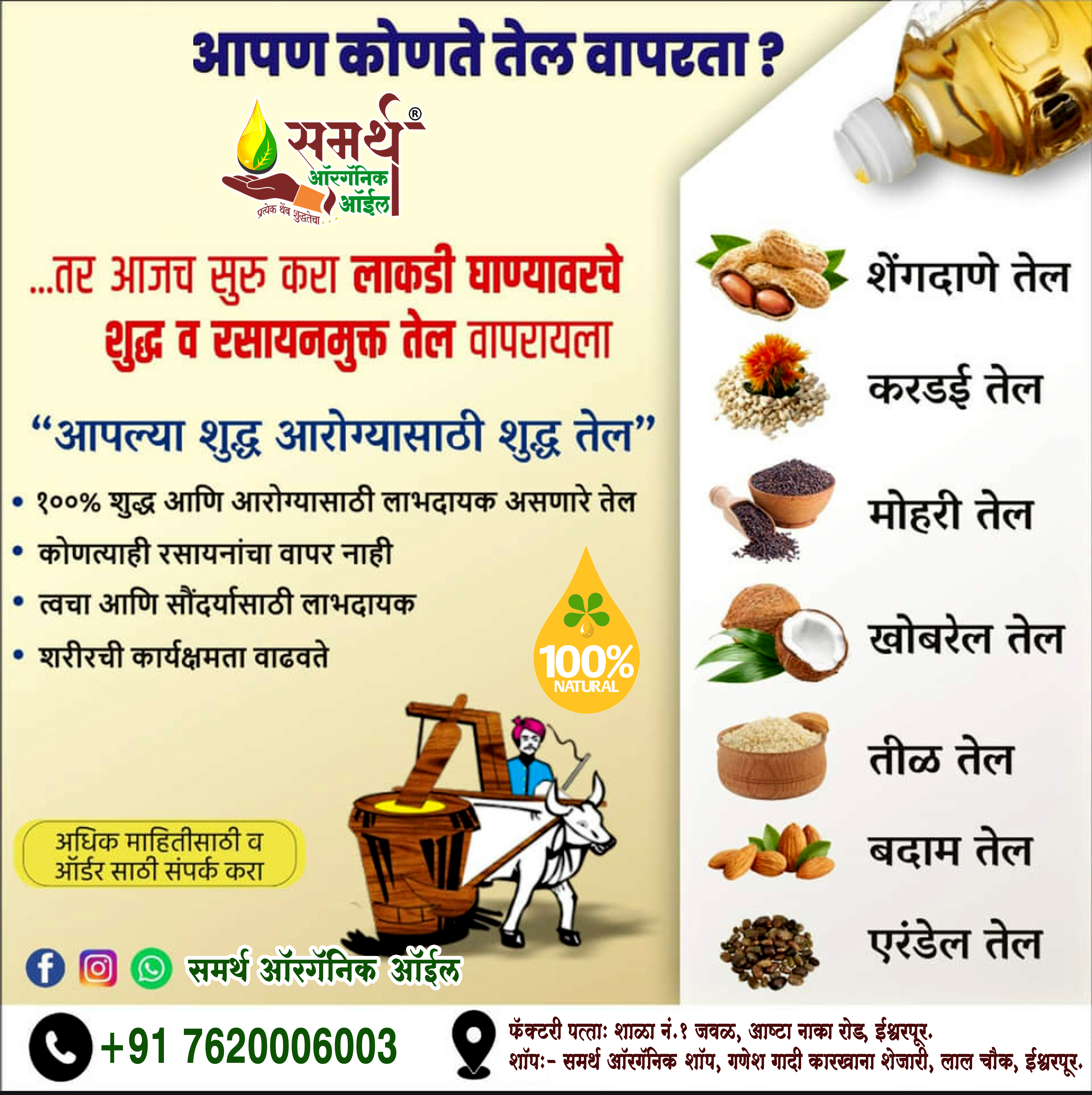 Whoodpressed Oil Manufacturing लाकडी घाण्यातून खाद्य तेल निर्मिती शेंगदाणा तेल, सुर्यफूल तेल, करडई तेल, तिळ तेल, मोहरी तेल, खोबरे तेल, जवस तेल, बदाम तेल, हेअर ऑईल & सेंद्रिय उत्पादने