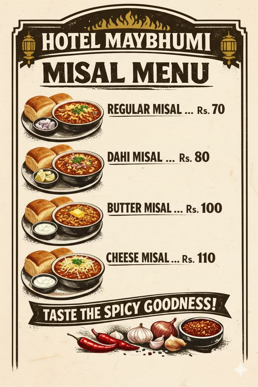 Misal Pav hotel - Dahi Misal, Butter Misal, and Cheese Misal.Our taste is homemade and authentic, with unique varieties that you won’t find everywhere.”